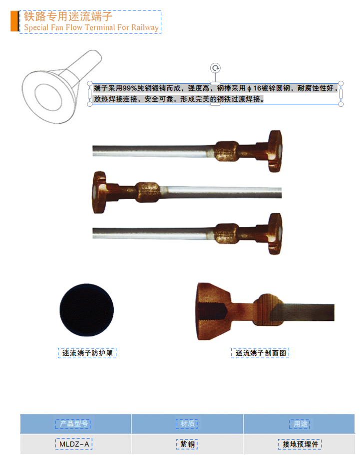 端子采用99%純鋼鍛鑄而成,強(qiáng)度高,鋼棒采用φ16鍍鋅圓鋼,耐腐性性好。放熱焊接連接,安全可靠,形成完美的鋼鐵過(guò)渡焊接。