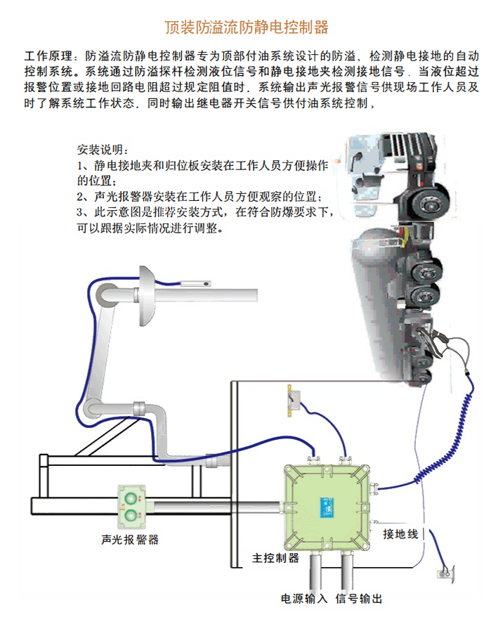 工作原理:防溢流防靜電控制器專為頂部付油系統(tǒng)設(shè)計(jì)的防溢、檢測(cè)靜電接地的自動(dòng)控制系統(tǒng)。系統(tǒng)通過(guò)防溢探桿檢測(cè)液位信號(hào)和靜電接地夾檢測(cè)接地信號(hào),當(dāng)液位超過(guò)報(bào)警位置或接地回路電阻超過(guò)規(guī)定阻值時(shí),系統(tǒng)輸出聲光報(bào)警信號(hào)供現(xiàn)場(chǎng)工作人員及時(shí)了解系統(tǒng)工作狀態(tài),同時(shí)輸出繼電器開關(guān)信號(hào)供付油系統(tǒng)控制,